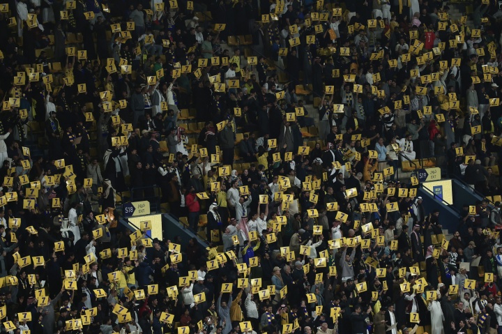 02月07日讯 沙特联第21轮,利雅得胜利对阵吉达联合。比赛第7分钟,胜利球迷全场高举C罗的7号声援队长。